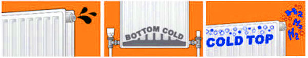 Peteklerde dibe çöken tortunun neden olduğu soğuma sık karşılaşılan bir durumdur. Yukarıda resimde gördüğünüz gibi siyah olarak gösterilen pislik peteğin alt kısmına su girişini engeller ve bu nedenle o kısım ısınmaz. Petek bağlantılarının ikisi de alttan olursa bu sorunu daha az yaşarız. Tesisatın temizliğini yaptırırsak bu sorun çözülür. Kaloriferin altının soğuk olması kadar olması üst kısmın soğuk olduğundan şikayet edenlerde çıkar. Peteklerde üstün soğuması bu kısımda hava kalması ile olur. Resimde mavi renkte görülen bölgelerde hava kaldığından ısınma olmaz. Hava alma tapasın dan boşaltıldığında üst kısım yanmaya başlayacaktır.