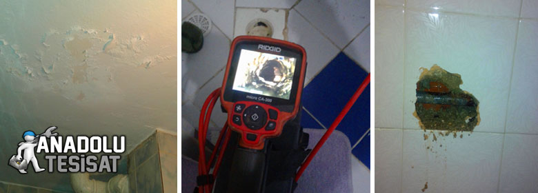Su kaçakları üst tavandan damlama gibi belirtiler verebileceği gibi duvar alt kısımdan başlayan duvar kabarmaları ile de belirti verir. Burada dikkat etmeniz gereken nokta ise; üst tavan ıslanıyorsa üst komşunuzdan şüpheleneceğiniz gibi kendi dairenizdeki su tesisat borularından da şüphelenmeniz olmalıdır. Gittiğimiz çoğu arıza kaydında, rutubetle su kaçağı da birbirine karıştıran müşterilerimiz kadar en az kendi su kaçağını üstten kaynaklandığını düşünen müşterilerimizde vardır. Bu nedenle, bundan emin olmak için kameralı cihazla su kaçak tespiti yapan firma servisine baktırıp durumun anlaşılması gerekmektedir. Evinize gelen servis ekibimiz şikayet olan bölgeleri inceledikten sonra cihazlarımızın yardımıyla duvardaki kaçağı aramaya başlayacaktır. Kameralı cihazda görülen kırmızı noktalardan geçen kaçakları gören ve akustik cihazın verdiği sesleri yorumlayan ustalarımız, onayınızın ardından tesisatı onarmaya başlayacaktır.